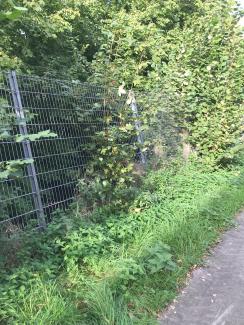 Durch den Bewuchs und ein Abflachen der Böschung, besteht die Gefahr, daß der Zaun in den Graben kippt.