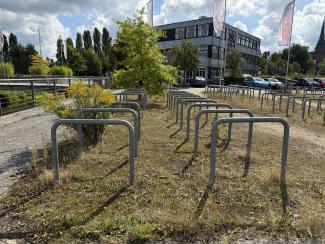 Guten Tag, die Fahrradbügel hinter Bruno Kleine sind teilweise zugewachsen.