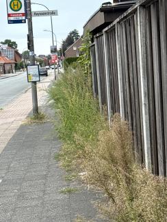 An dieser Stelle ist der Gehweg soweit zugewachsen, dass man ihn nicht benutzen kann in der Höhe des Bushaltestellen Bereichs
