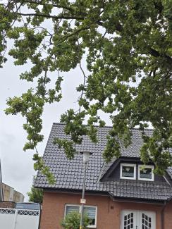 Unsere Eiche vorm Haus hat bei dem Sturm ziemlich viele tiefe Äste. Diese sind teilweise kurz vorm abbrechen und davor runterzufallen auf die Autos. Ebenso ist es uns nicht möglich mit unserem Kleinbus auf der Einfahrt zu fahren da die tiefhängenden Äste sonst abbrechen würden. Dessweiteren nimmt unser Auto Schäden.