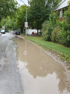 Straßenrand unbefestigt und überflutet. Grundschüler müssen auf die Fahrbahn ausweichen.
