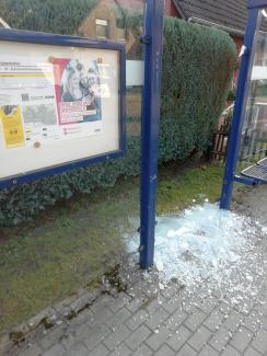 Die Glasscheibe der G-Mobil Haltestelle Eichenhofstraße, C1 Buterland/Erlöserkirche - Bf nahe der Adresse Eisenbahnweg 1. Die Scherben liegen teilst verteilt um dem Tatort herum, bedrohen jedoch nur den fußverkehr.