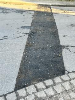 Straße wurde nach Erdarbeiten nicht vernünftig verdichtet, es sind Schlaglöcher entstanden und auf der Fahrbahn verteilen sich dadurch Steine.